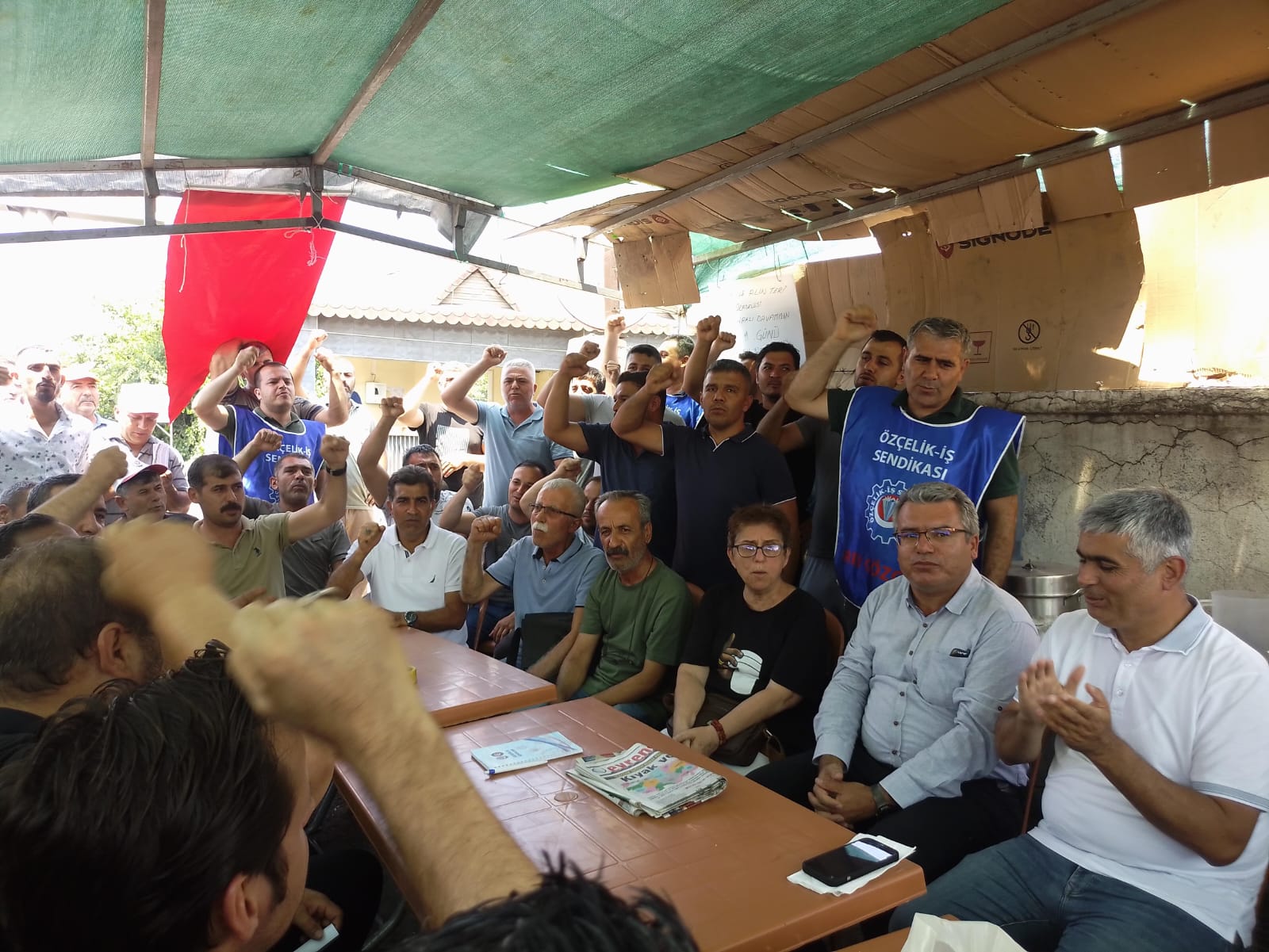 Özçelik-İş Sendikası Hatay Şube Başkanı Mehmet Güngör, “İlk gün de söyledim bugün de söylüyorum, hiçbir zafere çiçekli yollardan gidilmiyor. Yolbulan işçisi mücadele edemez, greve dayanamaz diyorlar. 7-8 yıldır örgütlüyüz. Yolbulan işçisinin sendikaya da kendilerine de güveni tam. Son rakam birinci 6 ay yüzde 50 zam veririm, ikinci 6 ay da yüzde 20 veririm, diyorlar. Peki, birinci 6 aydaki zammı neyin üzerine veriyorsun? Bu 14 bin TL’nin üzerine asgari ücret de değil. Yani şu an yüzde 70 zam vermelerine rağmen 23 bin 500 TL bize ücret öneriyorlar. Bu da ortalama ücret. Bunu kabul etmemiz mümkün değil” dedi.