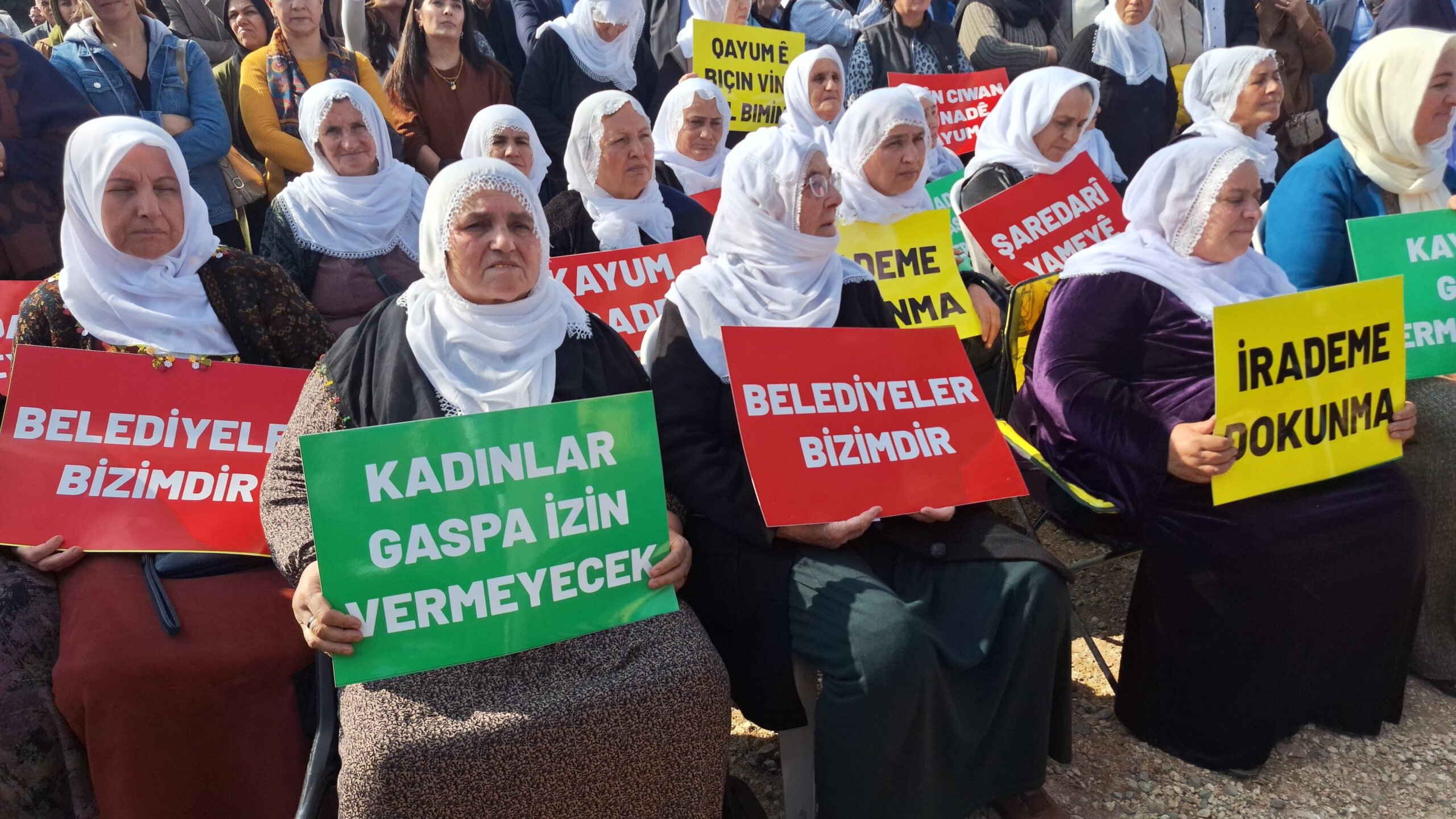 “Mardin Belediyesi önünde Kürt halkının iradesine sahip çıkma mücadelesi için tuttuğu nöbetteyiz. Bugün ülkenin dört bir tarafında Şimşek programı ile halkların boğazına çökenler aynı zamanda Kürt halkının da iradesini elinden almak için yine düğmeye bastı. Biz bu düğmeye basan elleri tanıyoruz. Bu eller size tarihi bir fırsat sunuyor diye çözüm adı altında halkı iradesizleştirmeye çalışanlarla aynı el… Bu el ülkenin dört bir tarafında işçi direnişlerine de neden olan ekmeği küçülten Şimşek programıyla bizi vergi yükünü altına sokan, her tarafta insanları artık açlıkla sınayan, eğitimsizlik ve sağlık hakkının gasbıyla sınayan el aynı el… Ve bu el bugün özellikle Kürt illerinde ‘terör’ başlığı altında ‘terör’ kıyafeti giydirerek esas terörizmi kendisi uyguluyor halklara. Ve çok iyi biliyoruz ki esas olan onların bölücülüğü. Onların bölücülüğünün sonuçlarıyla bugün biz karşı karşıyayız. Çünkü bugün iradesini ortaya koyan, kendi seçilmişleriyle bu belediyelerde hizmet almak için birlikte elini taşının altına sokan halkların cezalandırıldığı bir süreçte karşı karşıyayız.